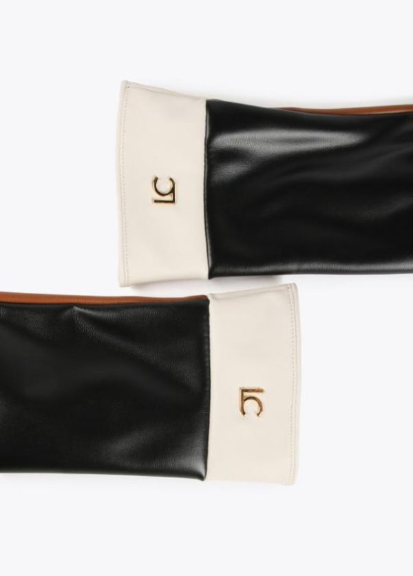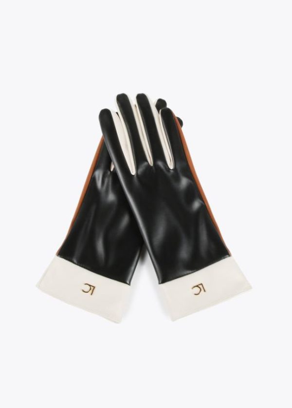 Guantes en efecto piel en tres colore combinados. Letra logo doradas en parte frontal.