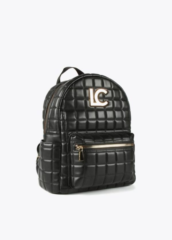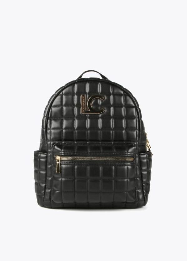 Mochila en efecto piel acolchada de cuadros con detalles dorados. Asa de mano y asas de espalda ajustables. Bolsillo delantero y bolsillo interior con cierre de cremallera.
