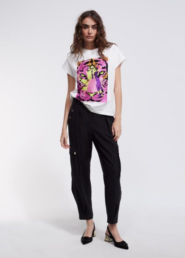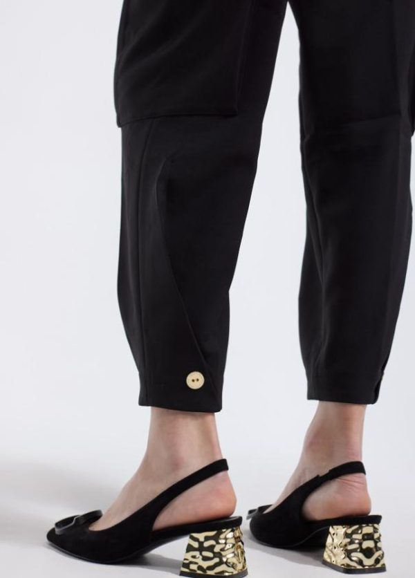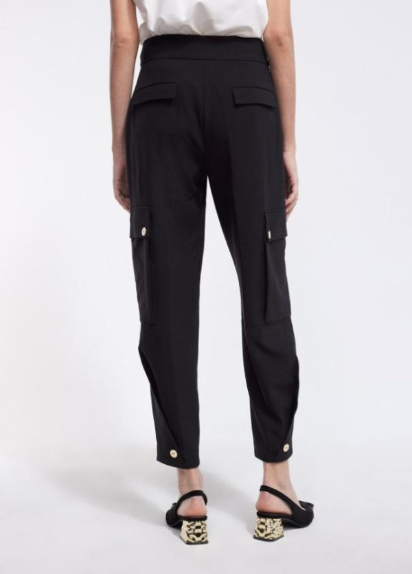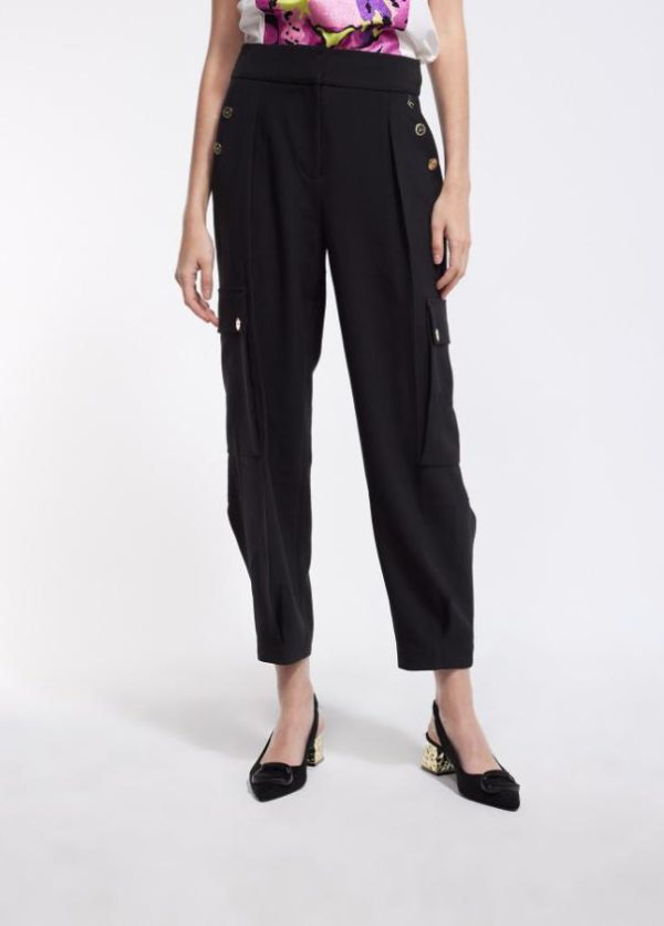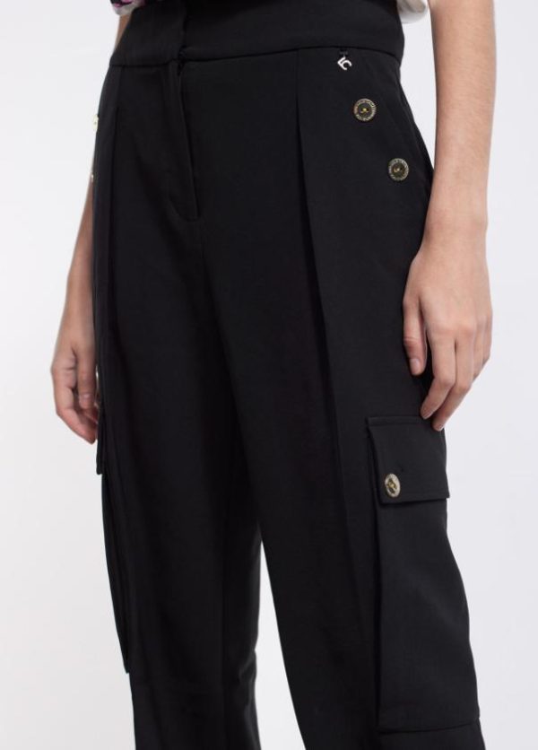 Pantalón cerrado con cremallera central y ganchos metálicos. Bolsillos laterales con botones dorados. Bolsillos cargo con tapete y botón en lateral pernera. Falso bolsillo con tapete en parte de atrás. Ligero recogido en bajo.