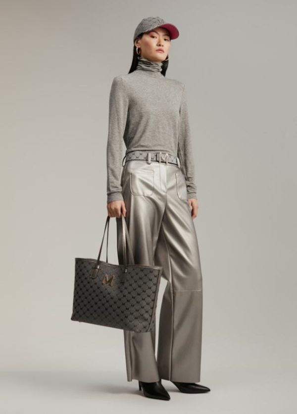 Pantalón de tiro medio efecto piel con trabillas. Pernera ancha y cierre frontal con cremallera y botón metálico. Bolsillos plastrón en delantero y bolsillos de vivo en espalda.