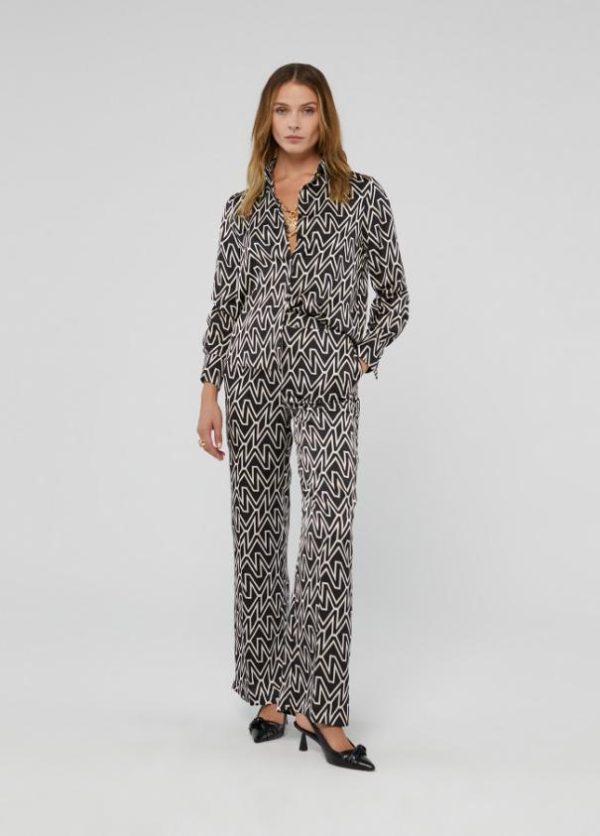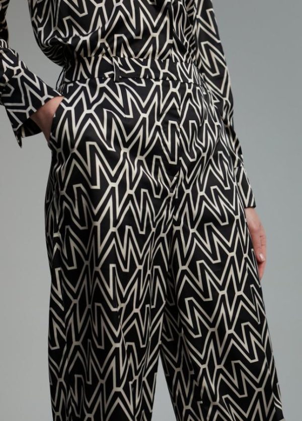 Pantalón recto y fluido en estampado monograma M bicolor. Cerrado con cremallera frontal y ganchos metálicos internos. Bolsillos laterales-