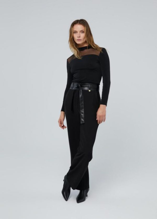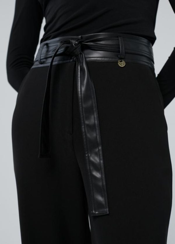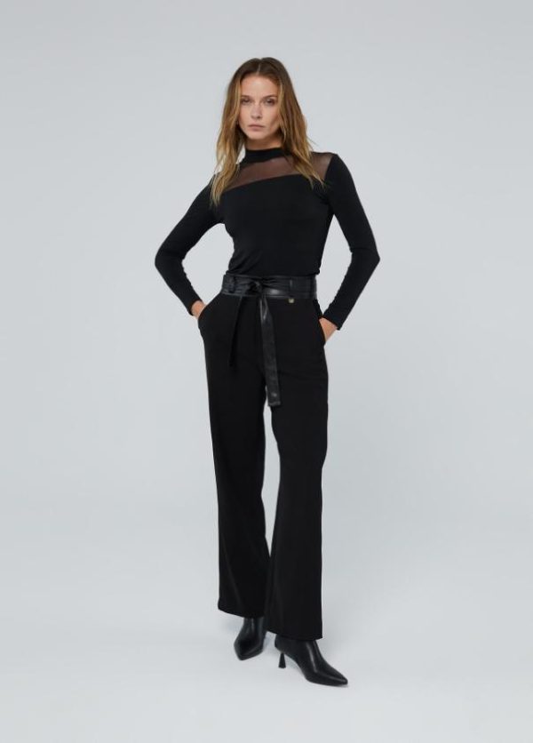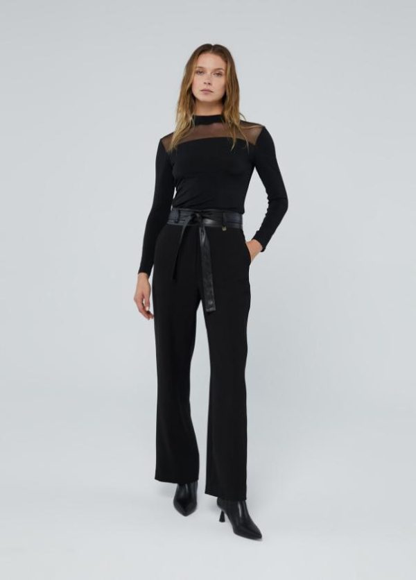 Pantalón recto de tiro alto negro. Cintura ajustable mediante cinturón en efecto piel. Bolsillos laterales y falsos bolsillos de vivo en espalda. Pernera recta y cierre frontal con cremallera.