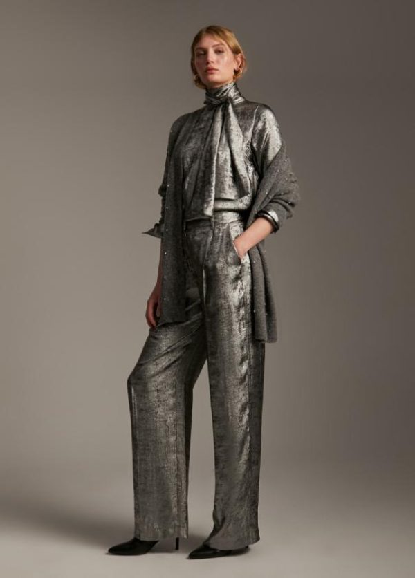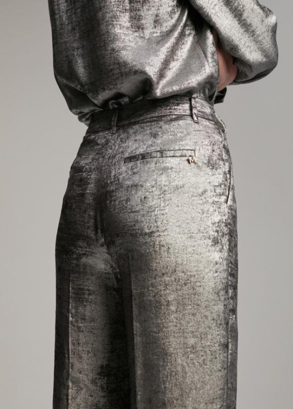 Pantalón recto efecto laminado. Cerrado con cremallera frontal y ganchos metálicos interiores. Trabillas en cintura y bolsillos laterales. Falso bolsillo tipo vivo en espalda.