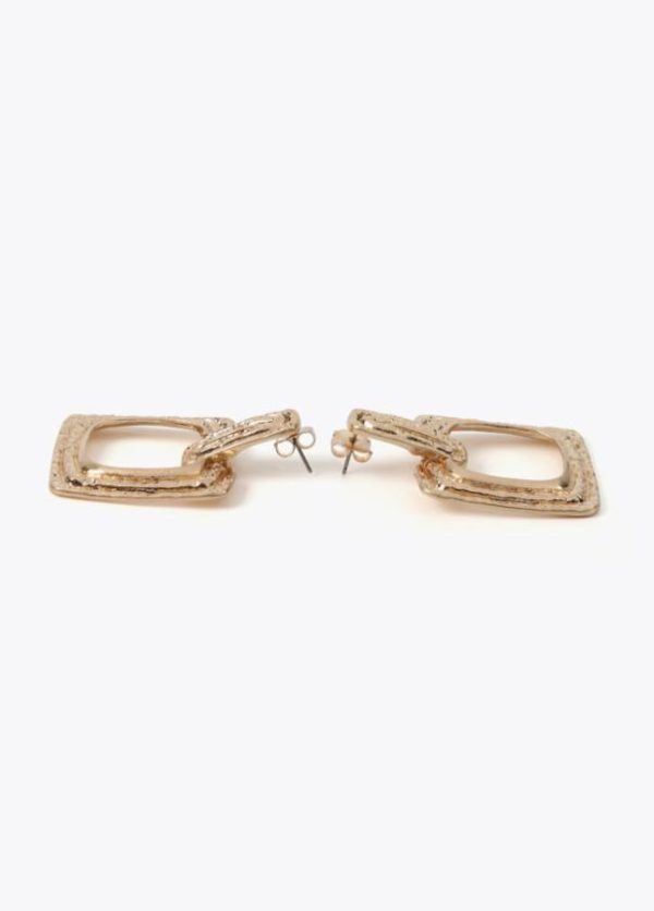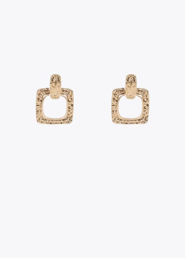 Pendientes de dos piezas en color dorado con textura punzada y logo grabado en parte interna.