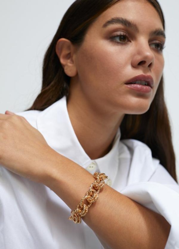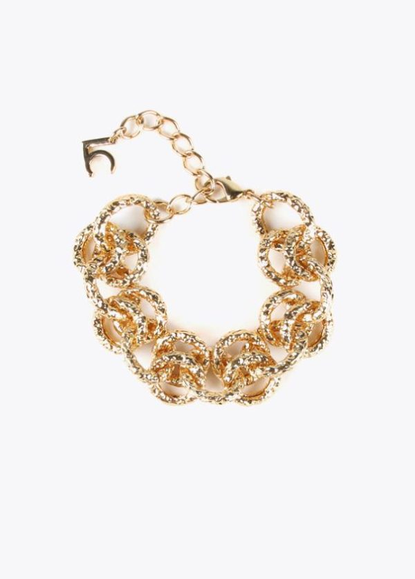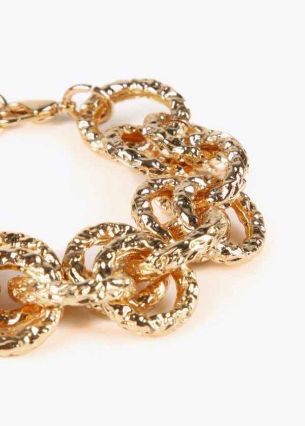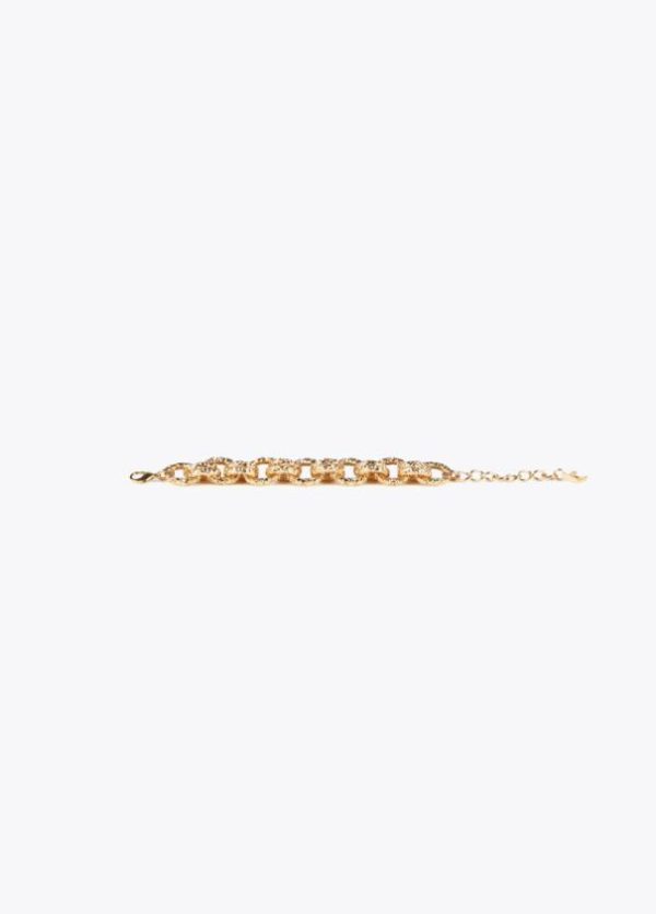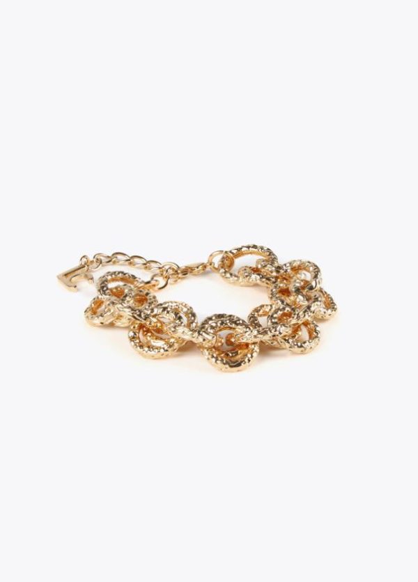 Pulsera de cadena dorada con textura rugosa y cierre ajustable. Detalle letras logo.