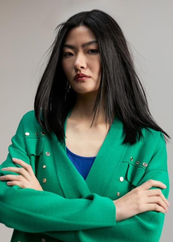 Cárdigan corto. Tapetes frontales y cerrado con dos botones metálicos. Detalle de mini espejos metálicos.