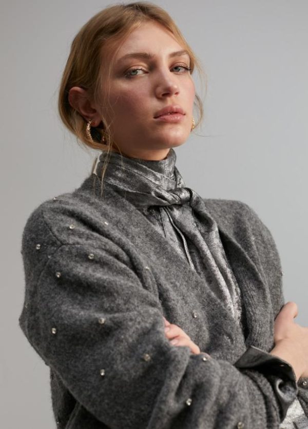 Cárdigan de punto abrochado con botones a tono. Detalle de piedras joya en toda la prenda.