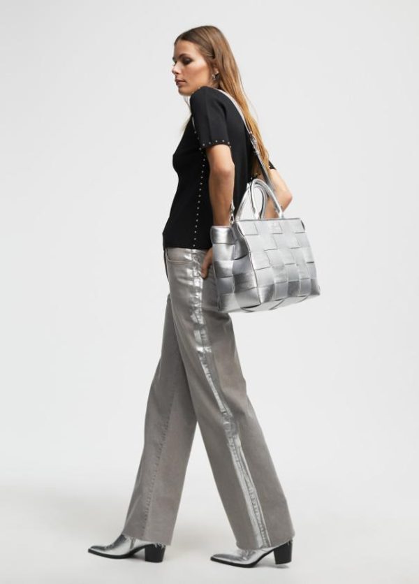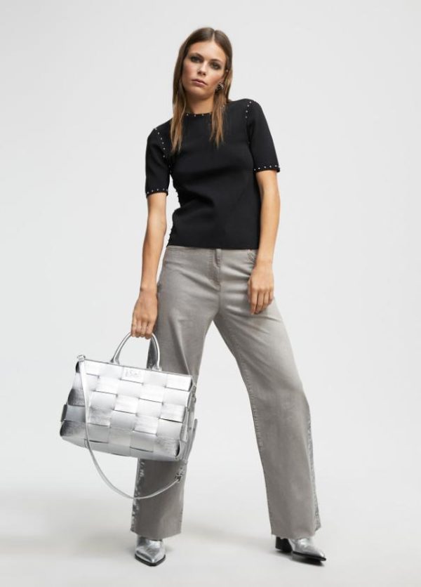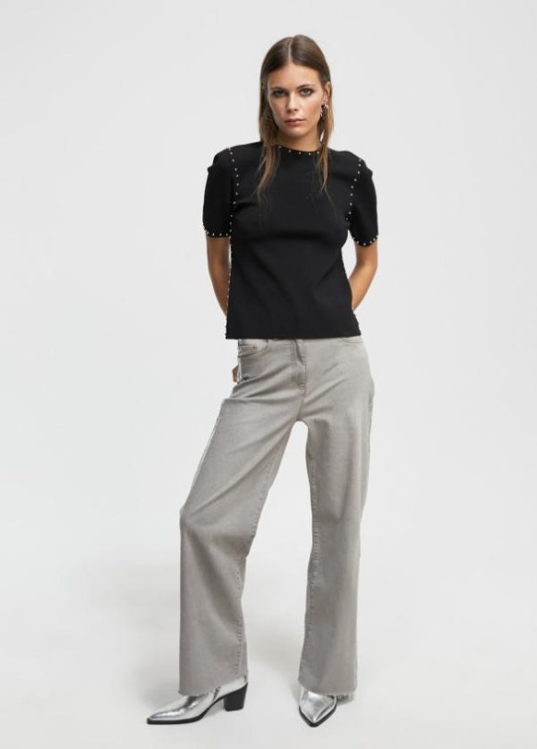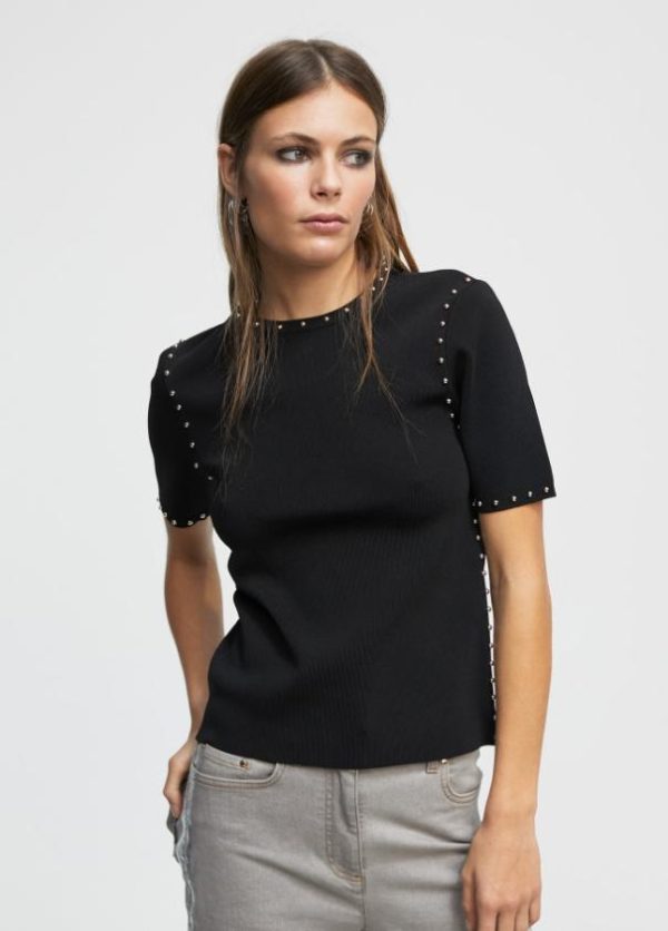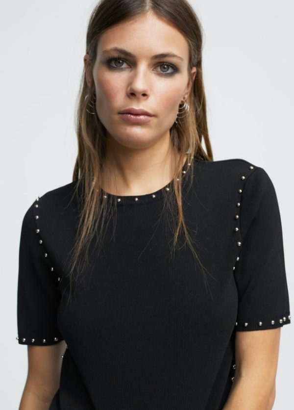 Jersey de cuello redondo y manga corta. Detalle de tachas doradas en cuello, sisa, manga y lateral.
