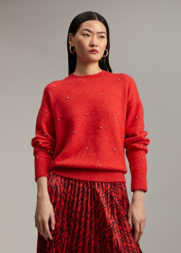 Jersey de cuello caja y manga larga. Rib en canalé en cuello, piños y bajo. Detalle de cristales en frontal y mangas.