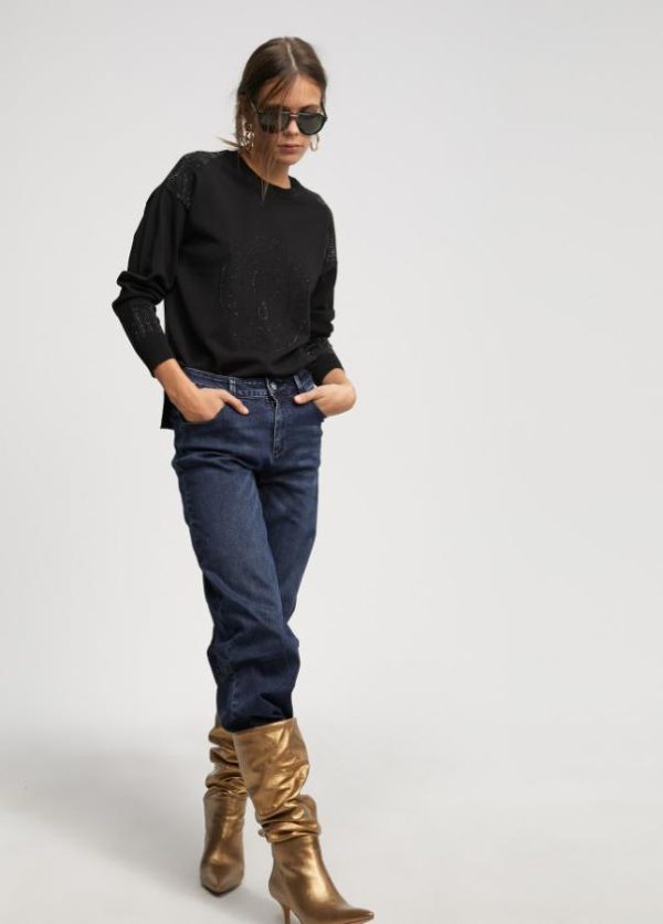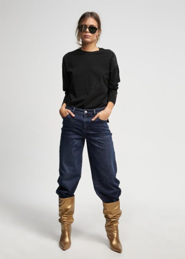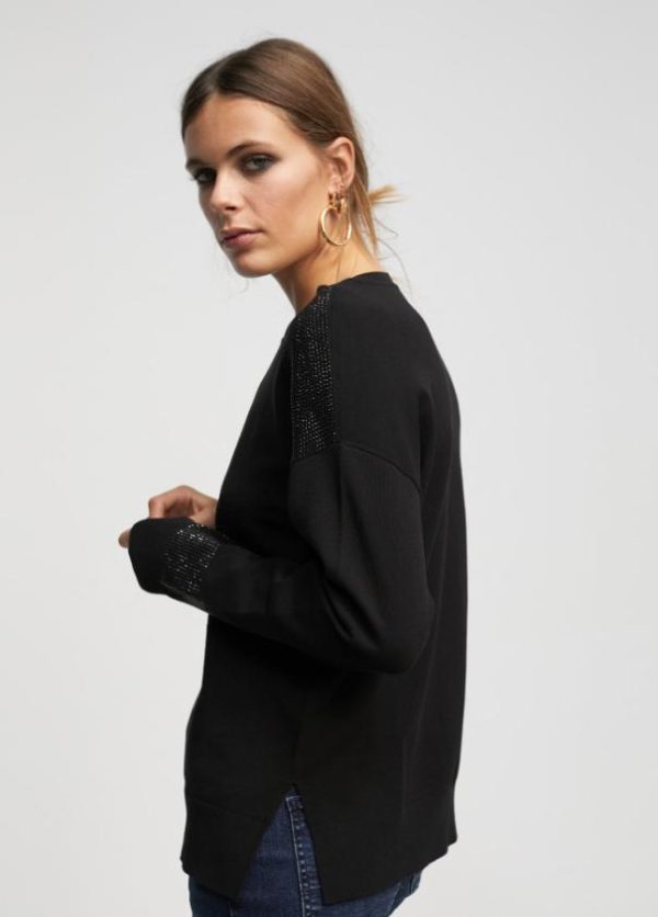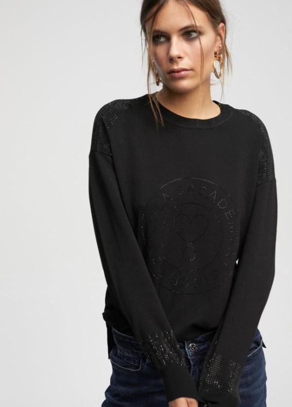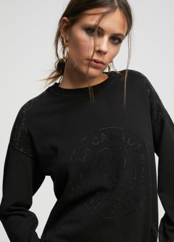 Jersey cuello caja y manga larga. Detalle de strass a tono en logo central, hombros y bajo manga.