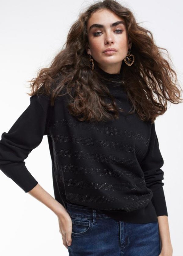 Jersey cuello perkins y manga larga. Detalle de strass a tono en líneas horizontales en frontal.