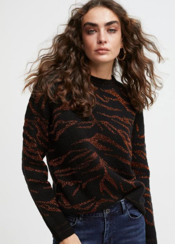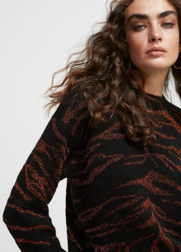 Jersey cuello caja y manga larga. Estampado cebra bicolor. Contraste en lúrex color cobre. Cuello, puños y bajo en color liso.