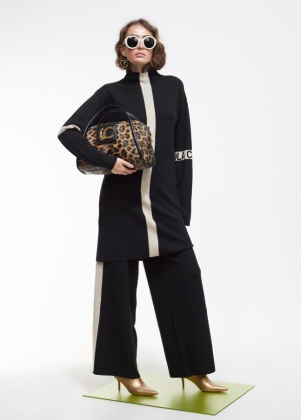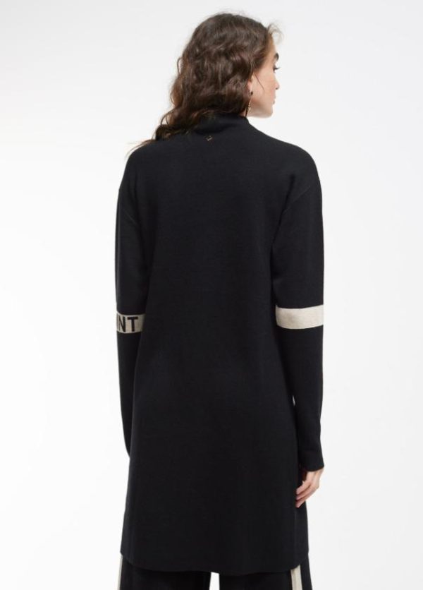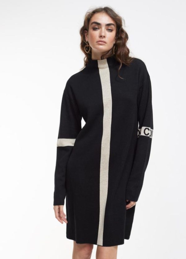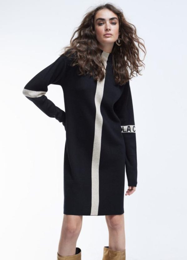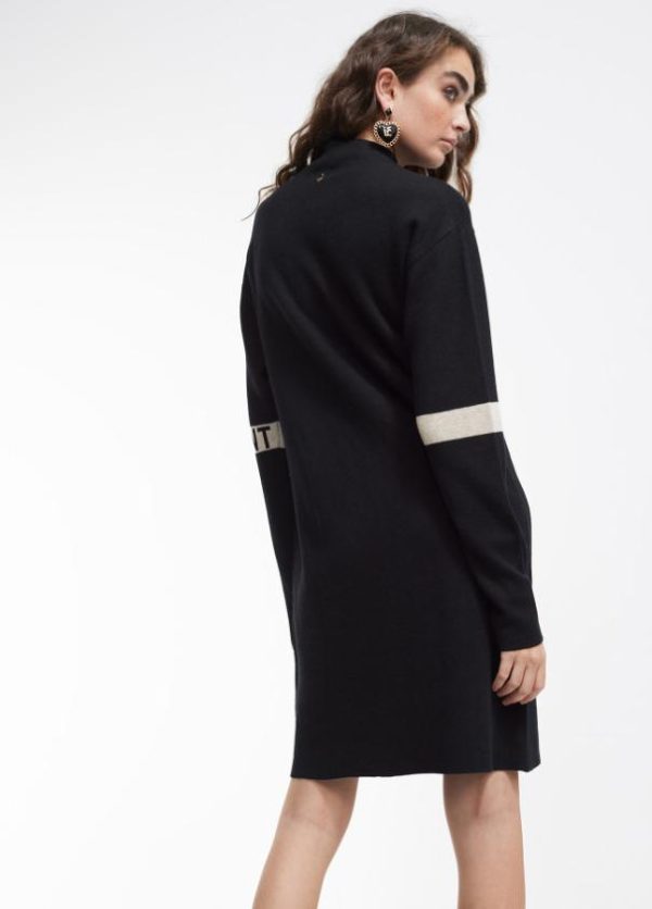 Vestido corto de punto. Cuello perkins. Detalle a contraste en banda frontal y logo en manga.