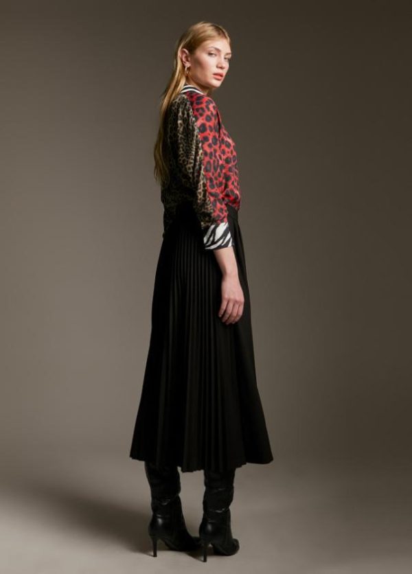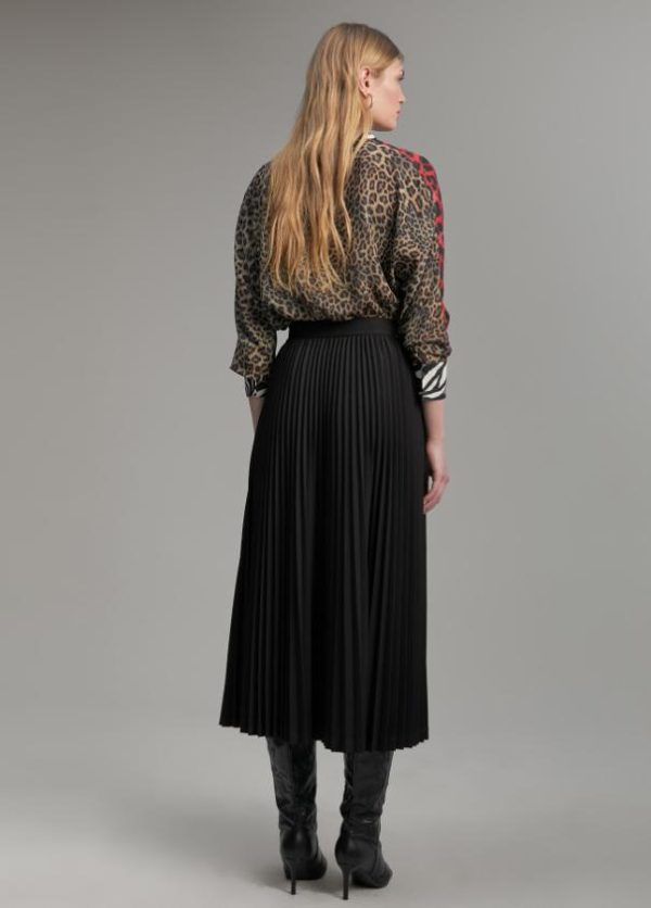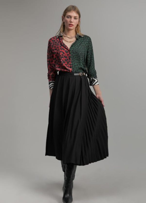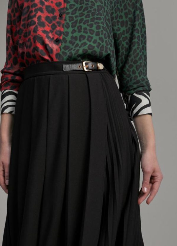 Falda de largo midi plisada. Cinturilla con detalle hebilla metálica.