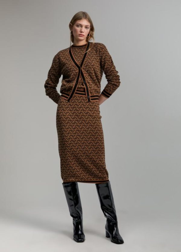 Falda de punto en estampado monograma bicolor. Cintura y bajo con rib contrastado.