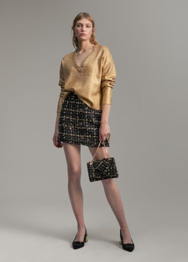 Falda corta a cuadros de tiro alto en combinación de color negro y detalles dorados. Cierre con cremallera en lateral oculto en la costura. Detalle de botones dorados en frontal y bajo desflecado.
