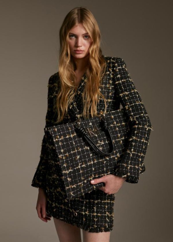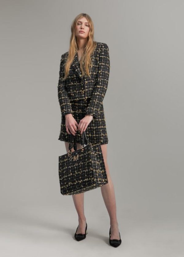 Falda corta a cuadros de tiro alto en combinación de color negro y detalles dorados. Cierre con cremallera en lateral oculto en la costura. Detalle de botones dorados en frontal y bajo desflecado.