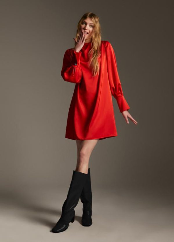 Vestido corto satinado de cuello caja y manga larga. Puños camiseros con detalle botón joya. Cinturón del mismo tejido y color.