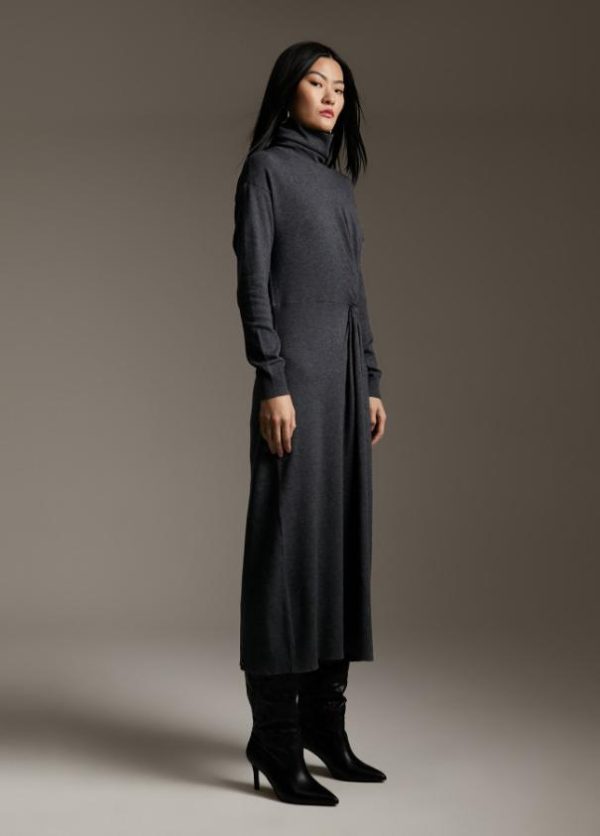 Vestido midi gris de punto y cuello alto. Manga larga y acabados en rib de canalé. Fruncido lateral.