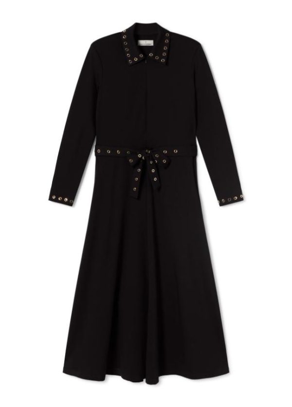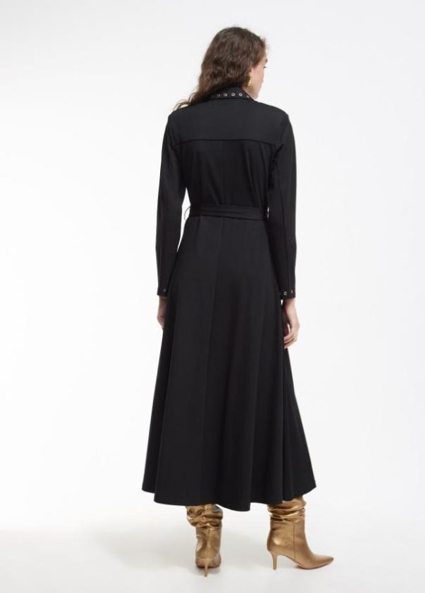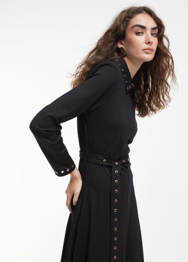 Vestido de punto de largo midi. Detalle de eyelets metálicos dorados en cuello, puños y cinturón. Abertura frontal con cremallera hasta bajo pecho. Ligera abertura frontal en falda.
