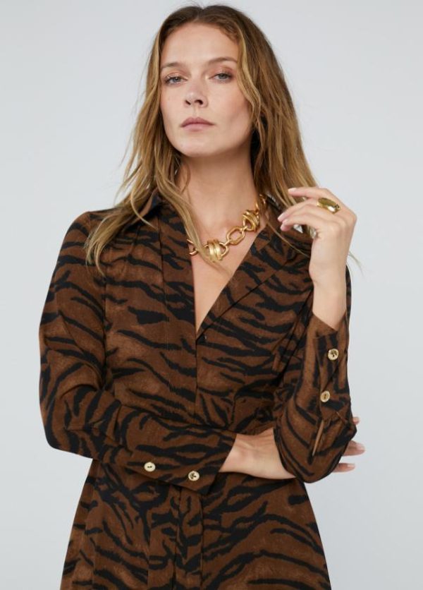 Vestido camisero con cinturón. Estampado bicolor en animal print. Cuello y puños camiseros. Abierto con botones hasta cintura.