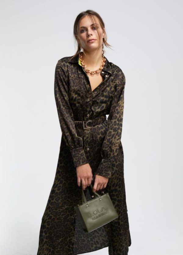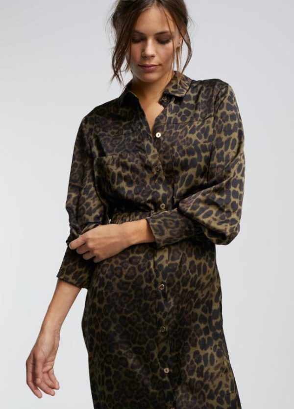 Vestido camisero de largo midi estampado en animal print. Cuello y puños camiseros. Abierto con botones dorados. Bolsillos plastrón en frontal. Cinturón elástico del mismo tejido y estampado con hebilla dorada.