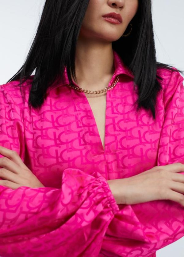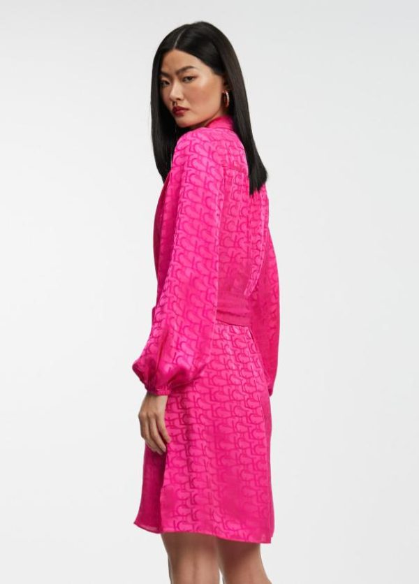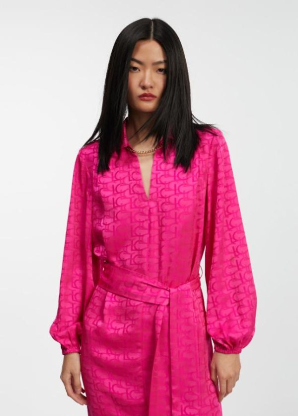 Vestido corto con tejido logotipado a tono. Cuello pico, bolsillos laterales y lazada en cintura. Puños camiseros con botón dorado.