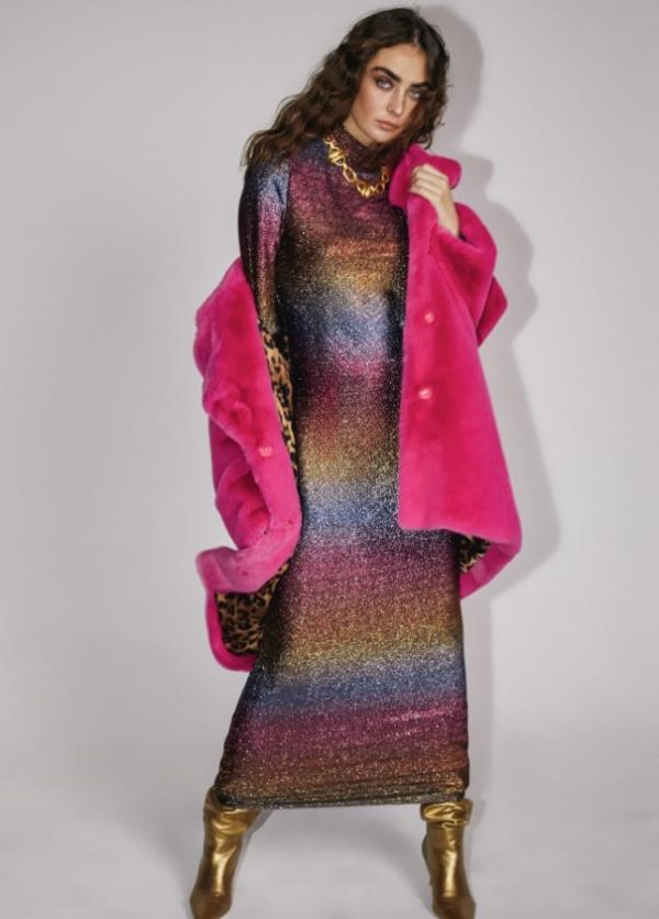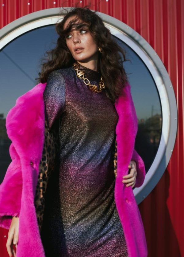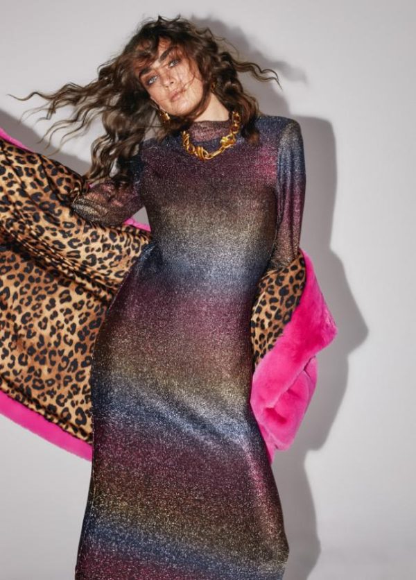 Vestido ajustado de largo midi. Tejido efecto metalizado tricolor. Cuello alto y abertura trasera.