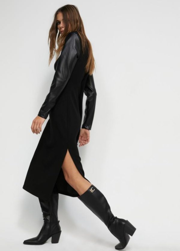 Vestido midi de punto roma. Cuello caja, hombreras y mangas en efecto piel. Abertura lateral en bajo.