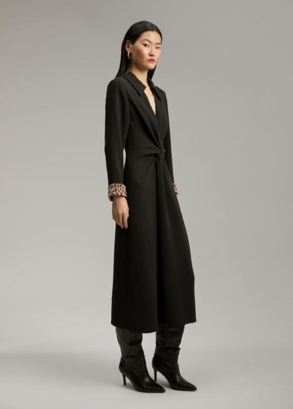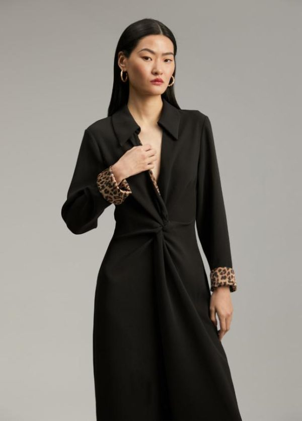 Vestido de largo midi. Cuello camisero y escote pico. Anudado en cintura frontal. Detalle en estampado animal print.