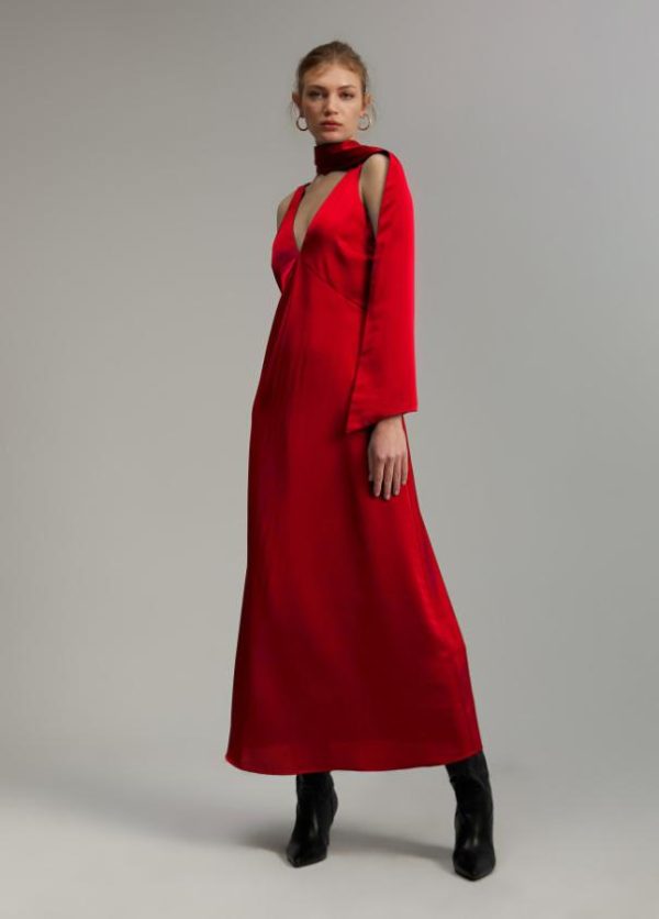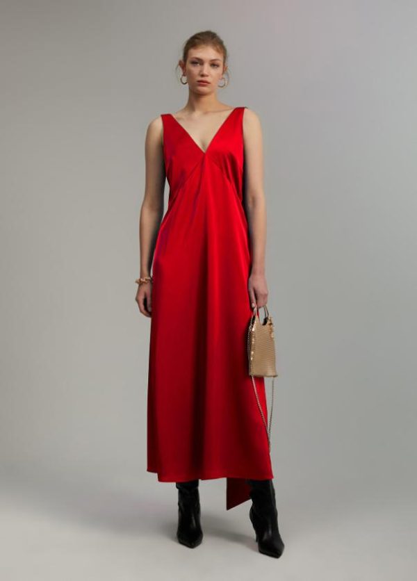 Vestido sin mangas, de largo midi efecto satén. Escote pico en frontal y espalda. Tirante efecto chal.