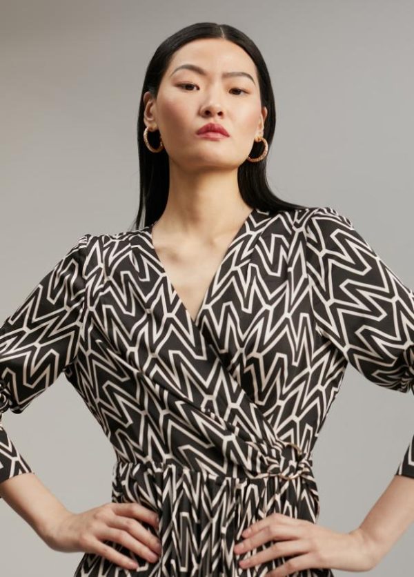 Vestido estampado en monograma M bicolor. Escote cruzado. Falda plisada.