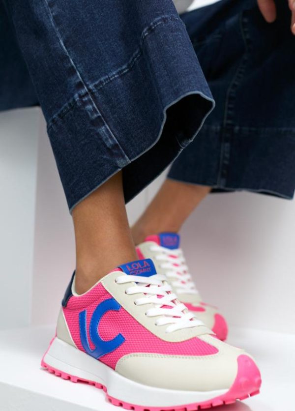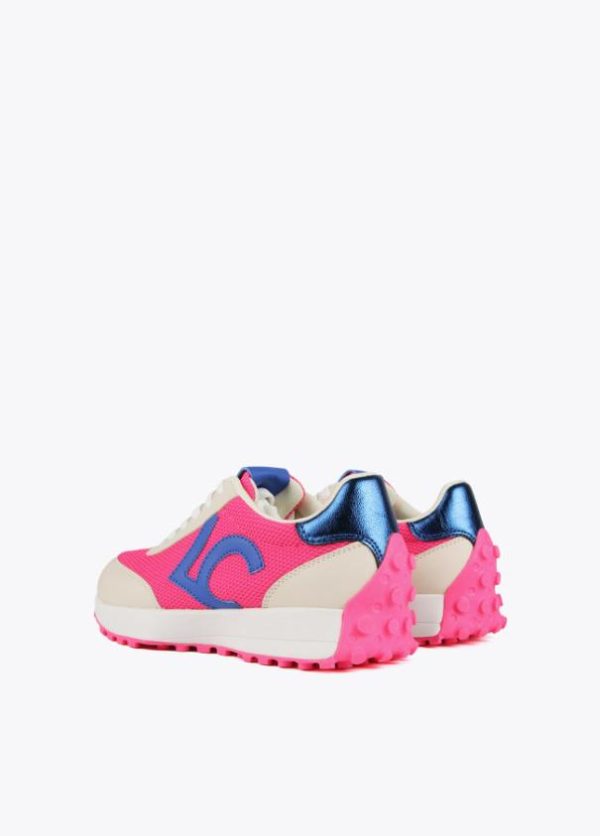 Zapatillas deportivas sneakers en color azul y rosa flúor. Letras logo en efecto piel en los laterales, lengüeta logotipada y detalle track en parte trasera.