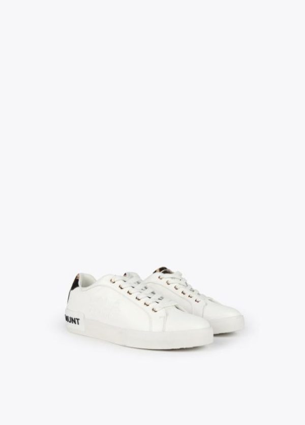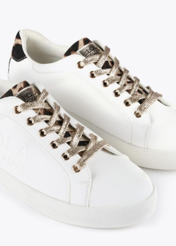 Zapatillas tipo sneakers blancas con detalles en animal print. Lengüeta y suela logotipadas. Cordones dobles, blancos y dorados.