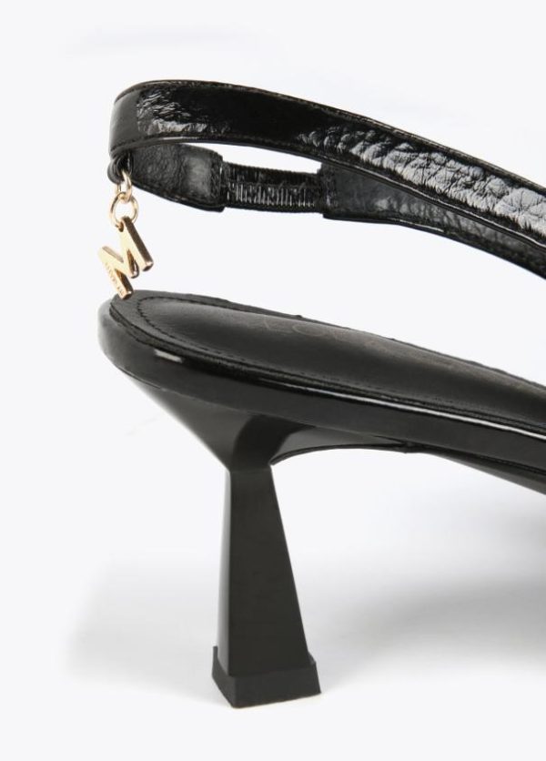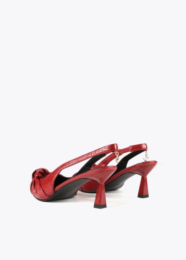 Zapato tipo stiletto destalonado en textura grabada y nudo en zona frontal. Detalle letra logo dorada y plantilla logotipada.